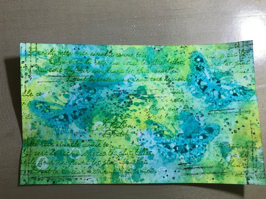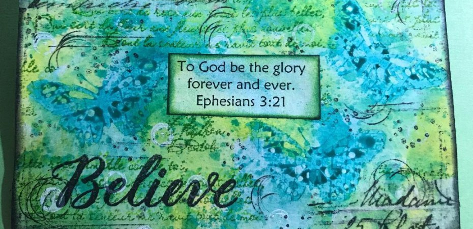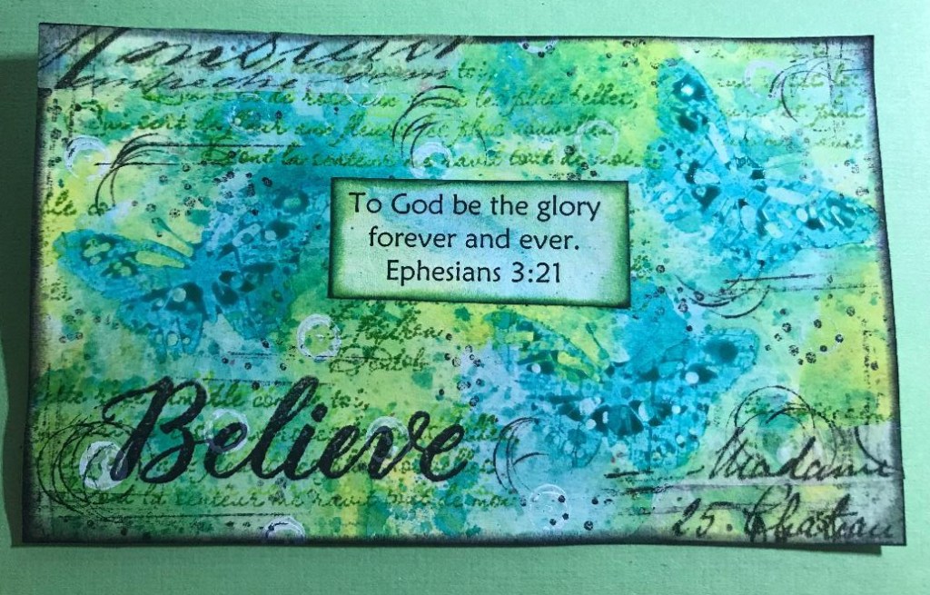My final idea before adding the printed out verse glued to card stock was to stamp the butterflies using craft glue tinted with Distress Spray. I just poured the glue in a little puddle on the mat, sprayed it, and stirred it together before dipping the stamp into it. This leaves a beautiful raised impression, dries fairly quickly, and wipes right off the stamp. Note that you don’t get the same perfect image you get when you use heat embossing.