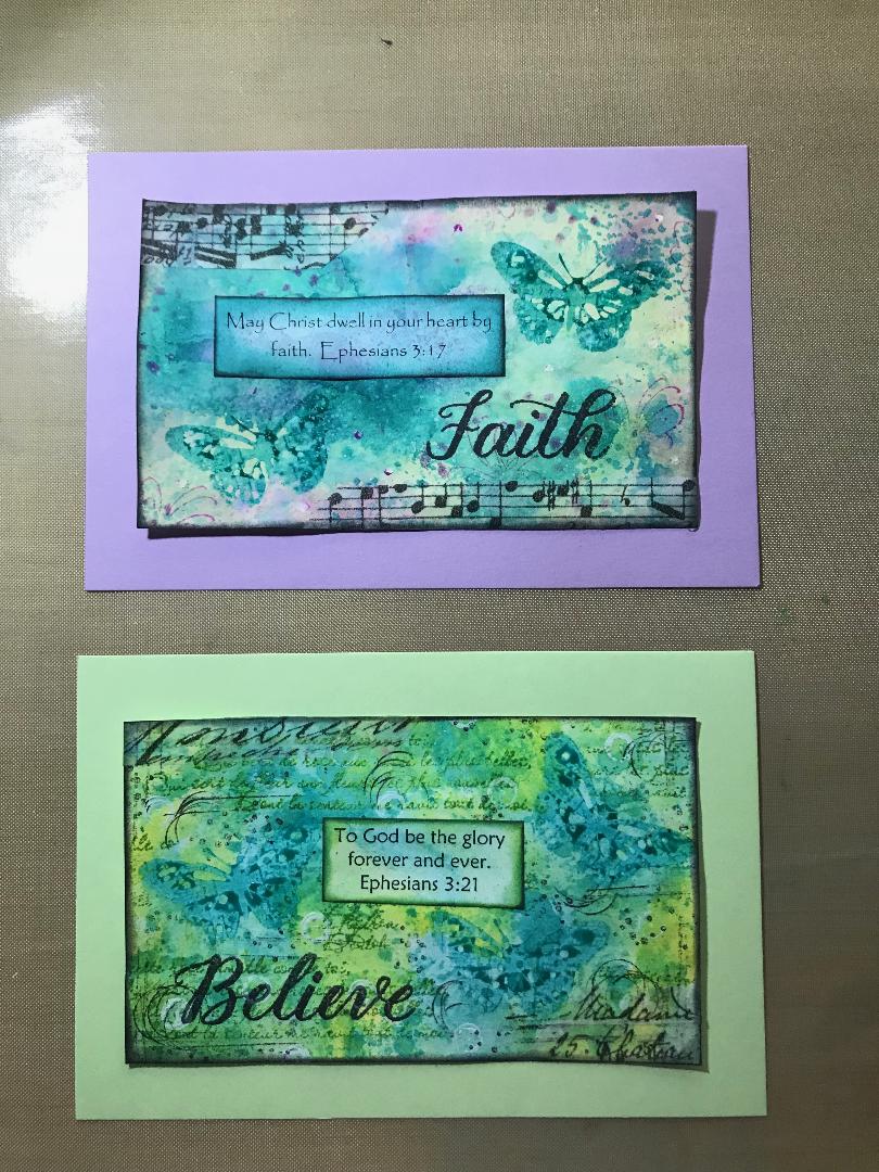 This is a project that I created by spraying Tim Holtz Distress Spray on a craft mat and smooshing the index card around in it. Then I added some stamping with a BoBunny script stamp on one card and some small line art butterflies on the other, along with some torn paper from the Tim Holtz tissue roll and two larger text stamps (Faith and Believe) done with black Memento ink.