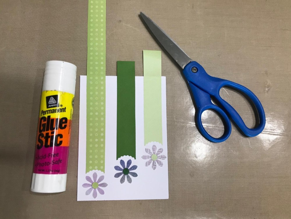 I glued the flowers on the card front first so make sure I had room for them, then I glued on the green paper strips. I waited until after I glued the strips to trim them. I was afraid If I cut them first I might make them too short!