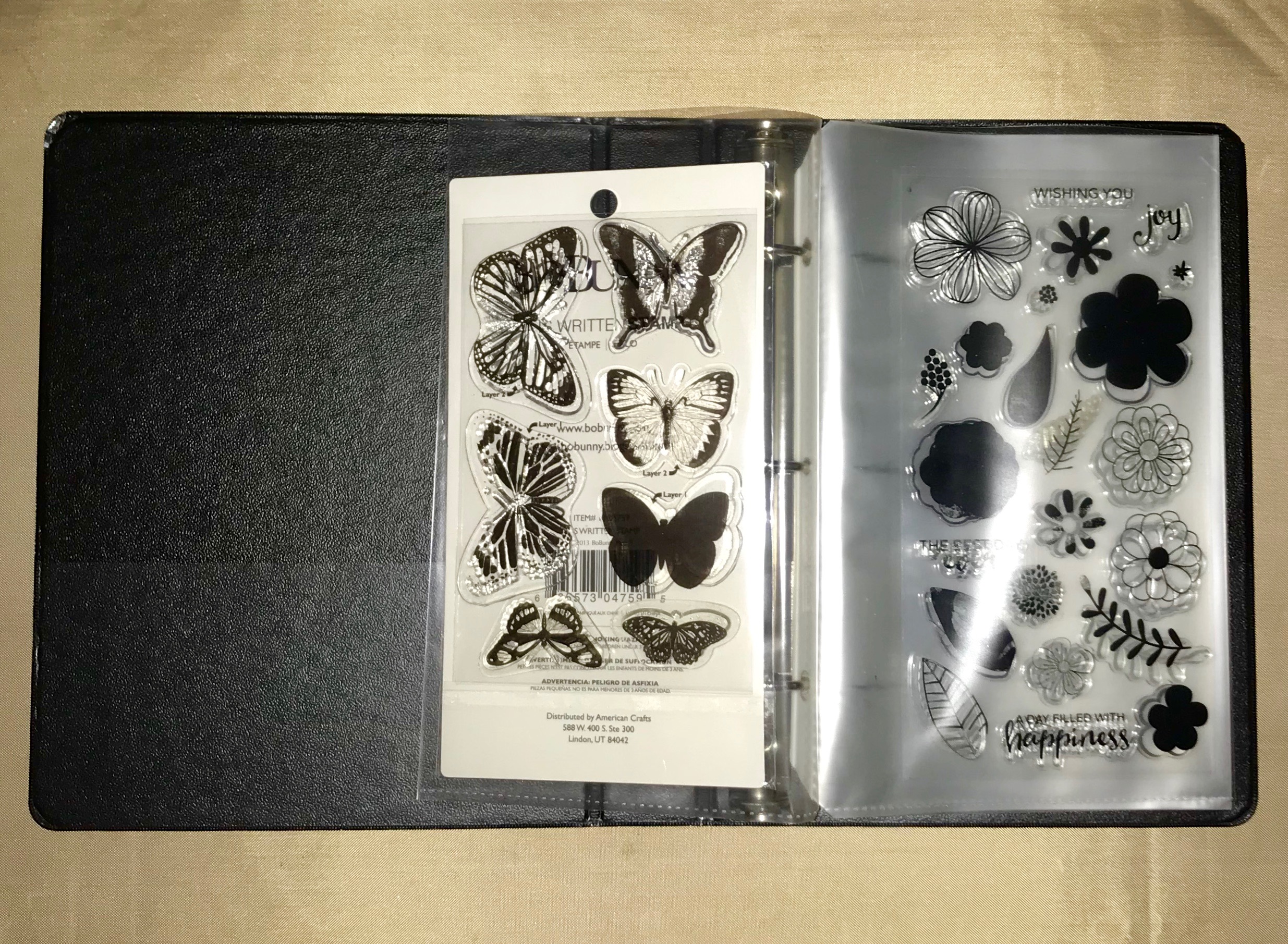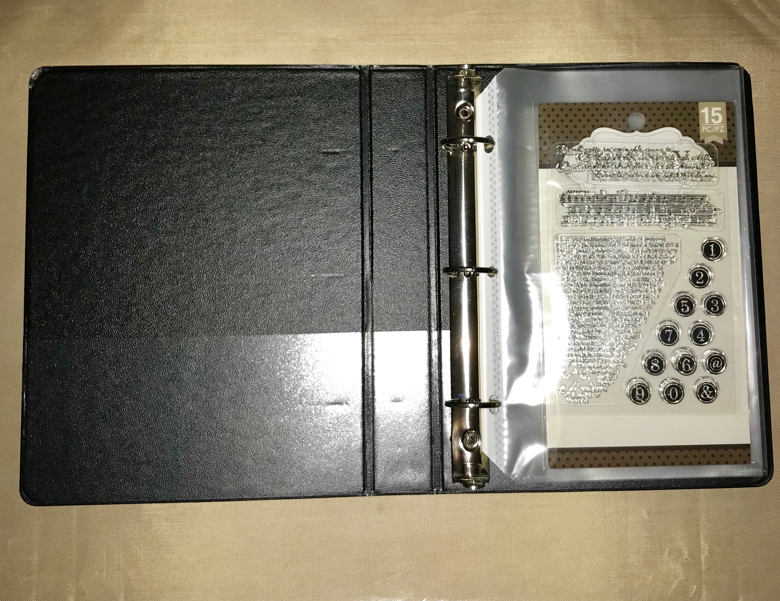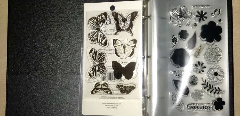 Flash forward to today, and I now have several stamp sets that are just piled up in a drawer, some still in the package and some not. So I was delighted to find this binder at my local Habitat for Humanity Restore, complete with inserts, for only a dollar! Now I can organize and protect my clear stamps, and free up the drawer space for other items.