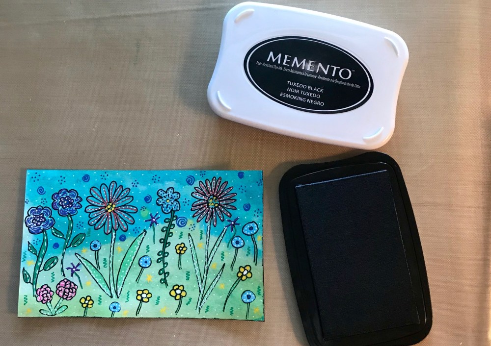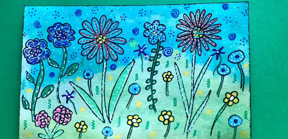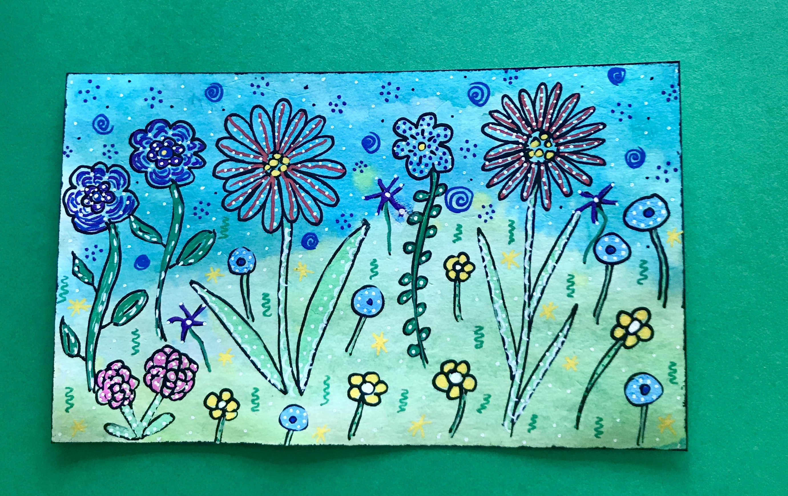 Next I drew my flowers with a black Posca pen. I love using these paint pens, but I’m a complete beginner with doodling. Luckily the goal of the ICAD Challenge is to just have fun and not worry about perfection!