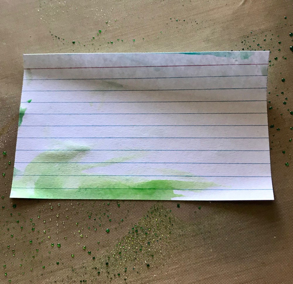 I smooshed the index card around in the ink until the entire background was covered with green at the bottom and blue at the top. The more water you use, the more of a watercolor effect you get on the paper.