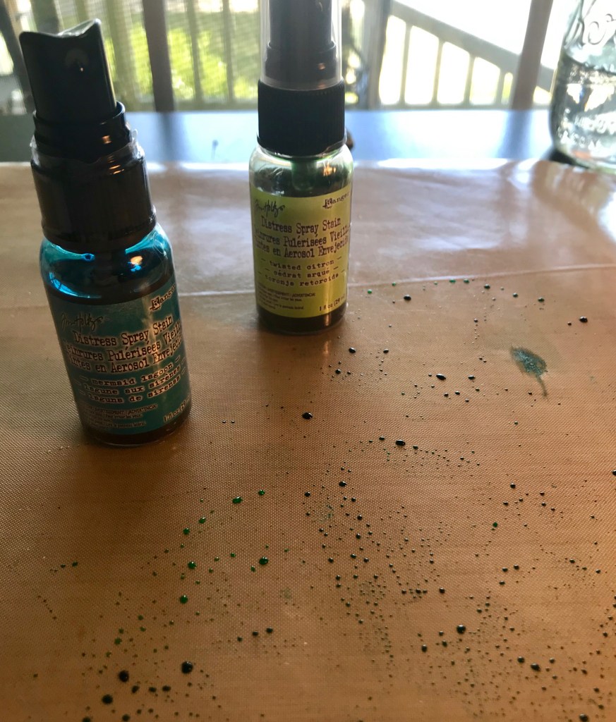 I created the background with Tim Holtz Distress Ink Sprays in Twisted Citron and Mermaid Lagoon. I spritzed them on my craft mat and then diluted them slightly with a mini mister.