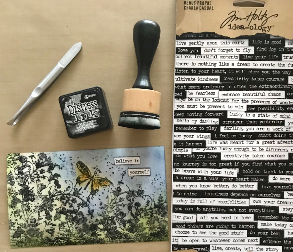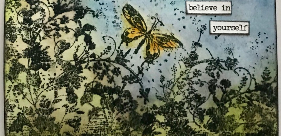 Because this was a new stamp for me, and the direction of the butterfly and vines was vertical rather than horizontal, I did a practice run on scrap paper before stamping the project card with it. I didn’t want any of the lettering on the right, and I had to stamp the vines multiple times to cover the card, so I had to ink the desired section of the card carefully before stamping. I used my trusty Memento Ink in Tuxedo Black to get a waterproof image.