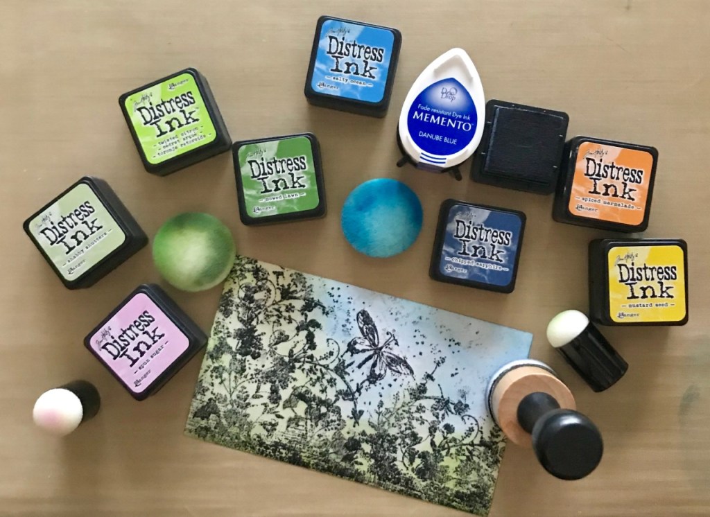 Then it was time to have fun with color! I used several different distress ink pads from Tim Holtz, and one lonely Memento Dew Drop Ink in Danube Blue. I used the round ink blending tool for the larger areas, and the finger sponge daubers for the smaller areas where I needed more control and precision.