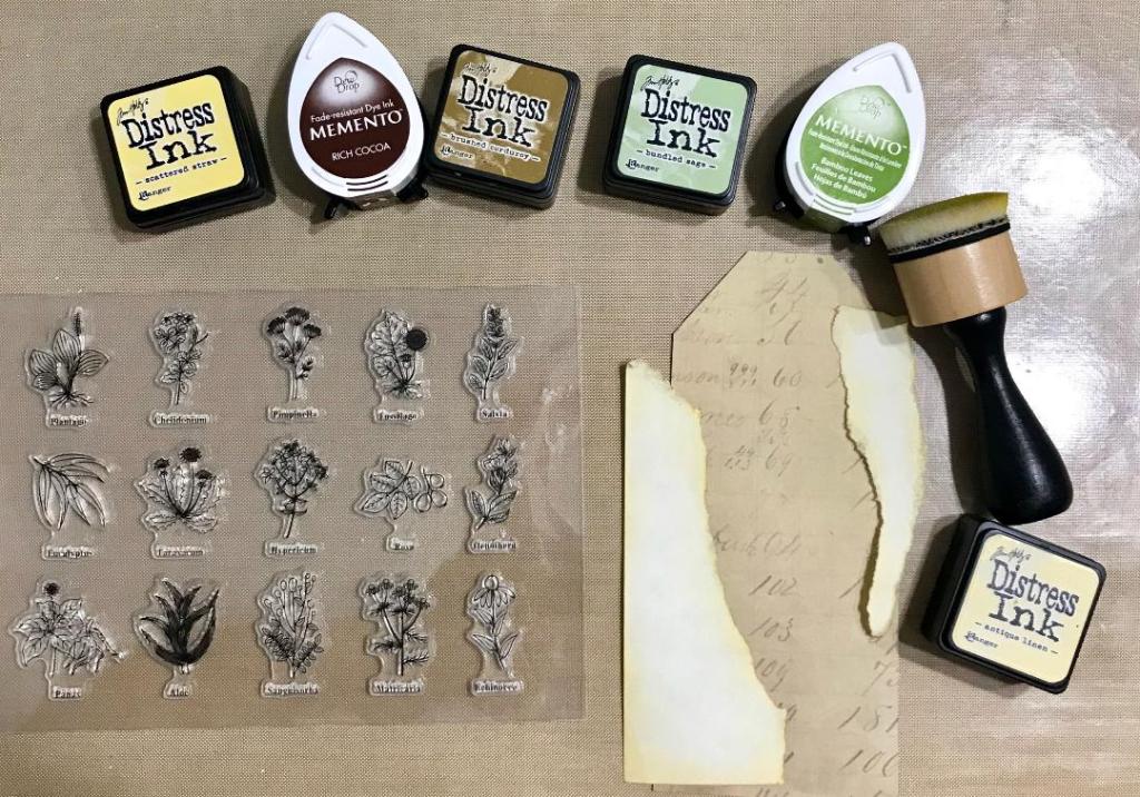 I just got this set of botanical stamps and I couldn’t wait to start using it. The price is fantastic but the shipping takes awhile, so I was more than ready to try it out once it arrived! I picked out an assortment of ink: Distress Ink in Scattered Straw, Brushed Corduroy, and Bundled Sage; and Memento Dye Ink in Rich Cocoa and Bamboo Leaves. Also used but not pictured: Distress Ink in Milled Lavender and Memento Ink in Elderberry.