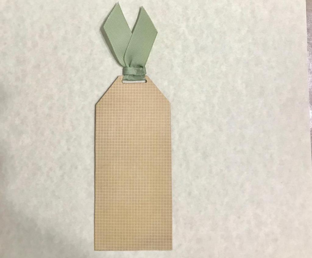 I had a scrap of wide green ribbon that I thought would make a great accent for this tag, so I used a slot punch instead of a hole punch, and I punched it twice to get it long enough for the ribbon to fit through. I used a small bit of the ribbon rolled up narrowly to wrap around and secure the bottom of the ribbon to keep it from flopping over. (Sorry about using the word “ribbon” so many times! And sorry I didn’t take pictures of this step.)