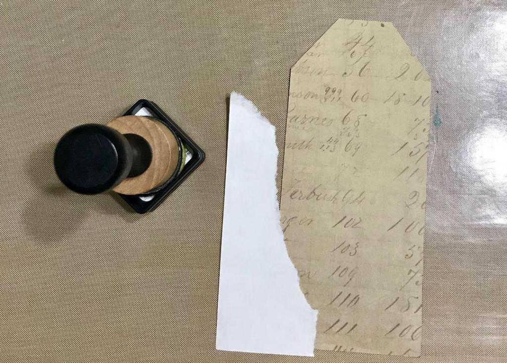 I accented the background with some torn copier paper that I aged with Tim Holtz Distress Ink in Antique Linen. This photo (kind of) demonstrates how I store the foam sponges for my blending tool. I keep them in the bottom of my mini ink pad with the color side down and the velcro side showing. That way I can just press the blending tool onto the velcro and pick up the foam without getting ink on my fingers. Now if I could just figure out how to take the foam off the blending tool without getting ink on my fingers….!