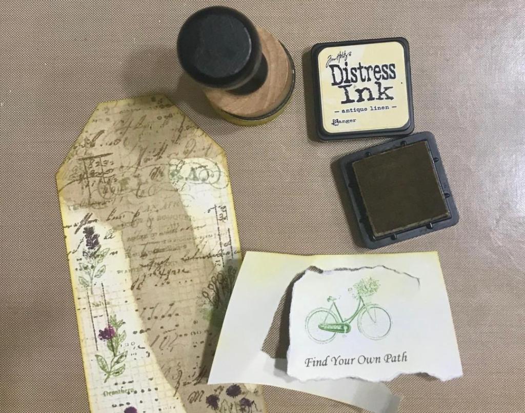 As you can see from the photo, I inked the edges of this tag twice. I went around it Antique Linen Distress Ink first, but I thought it needed a more defined frame so I went back over it with Vintage Photo Distress Ink.
