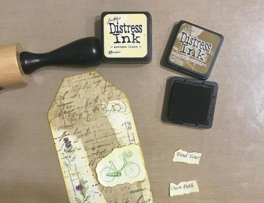 I inked the edges with Antique Linen Distress Ink, and glued them onto the tag with my Avery permanent glue stick.