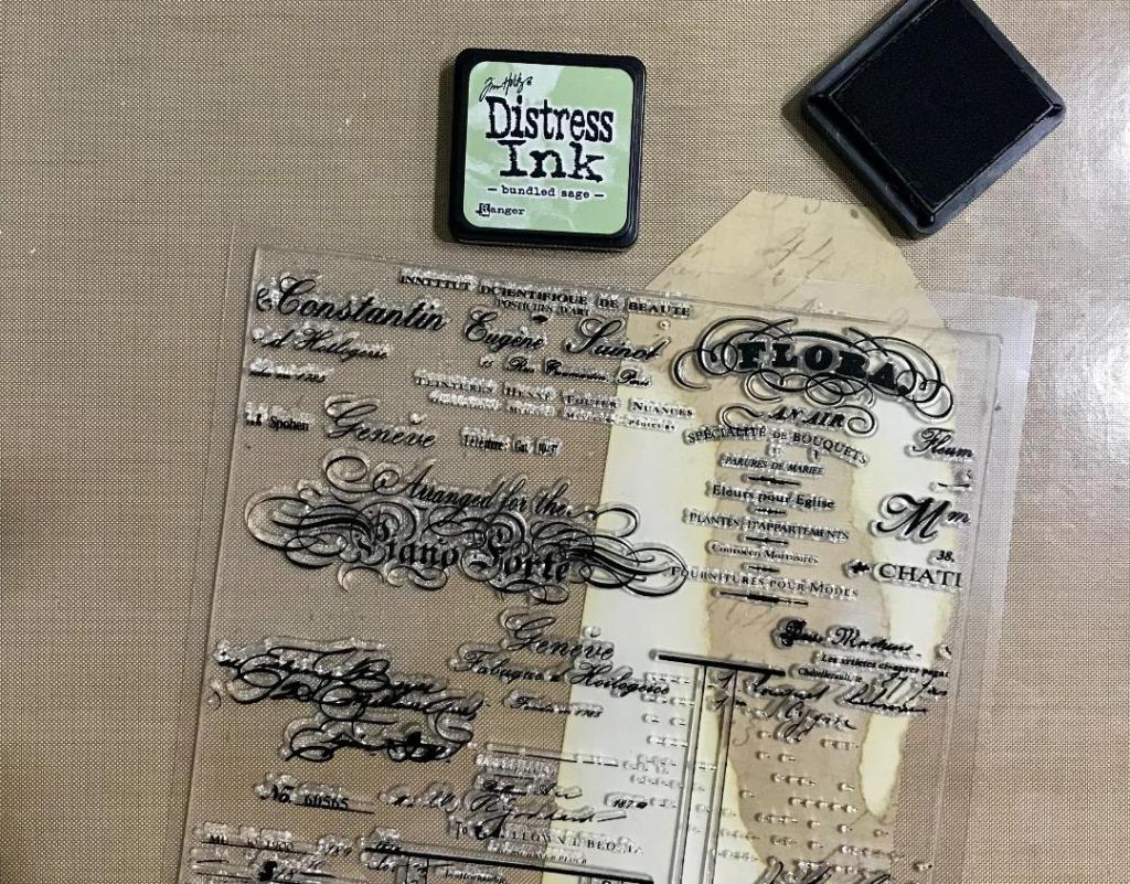This French Script Stamp is another incredible bargain with slow shipping, but it was definitely worth the wait. It’s so versatile for stamping backgrounds, but it can also make some lovely focal points as well. It may appear to be several stamps on the same backing, but it’s actually one large stamp. I considered cutting it apart because I don’t have a stamping block large enough to accommodate it, but I think I prefer just inking the portion I want to use instead of separating it. I did not even peel the stamp off of its plastic backing; I left it on to give the stamp a little more stability since I’m using it without a block.