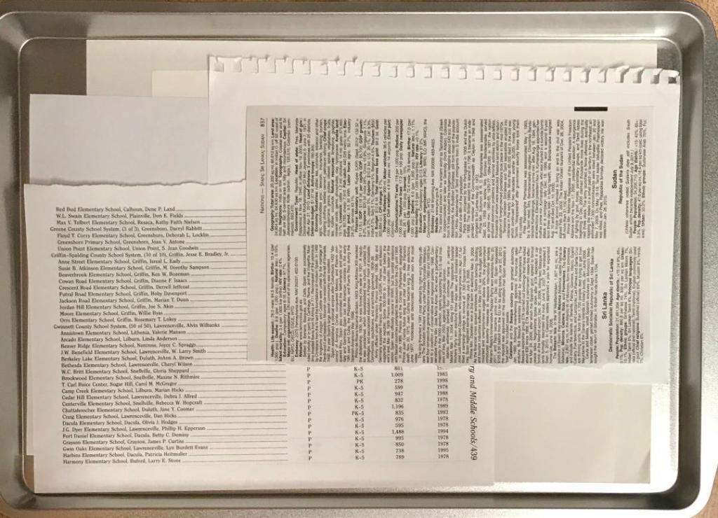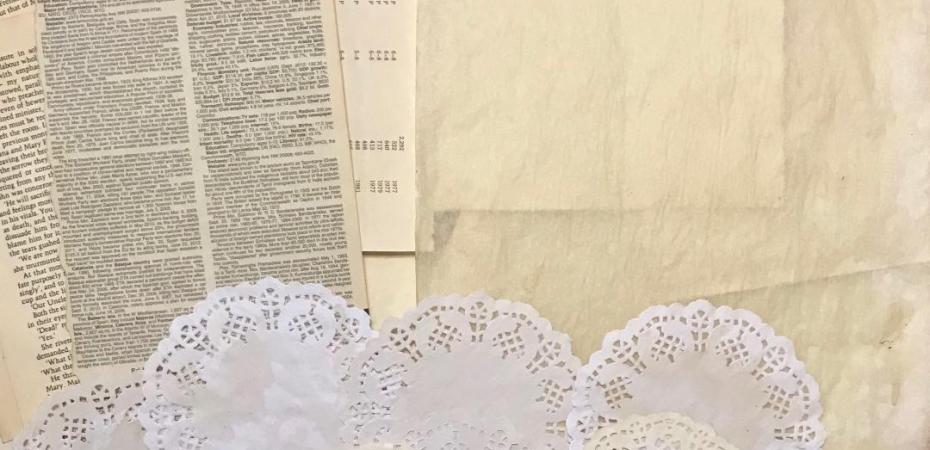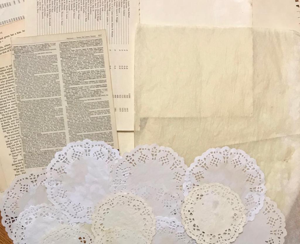 I use a sheet pan that I bought from the Dollar Tree, and I just layered my doilies in it along with a few sheets of various types of paper.