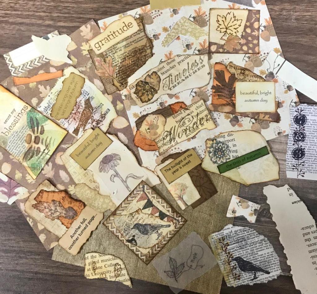 I had fun last weekend making some ephemera for my autumn file folder journal! I used some of my autumn patterned paper, some stamps and stencils and distress ink, old book pages, stickers, fall colors of card stock, and some quotes about autumn.