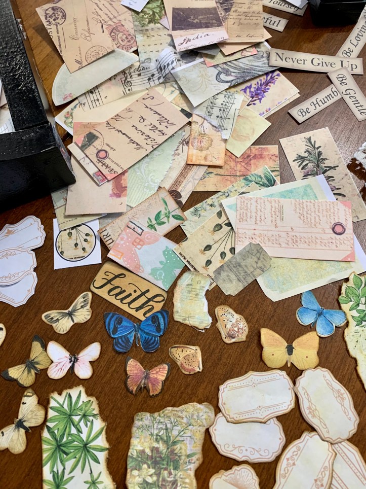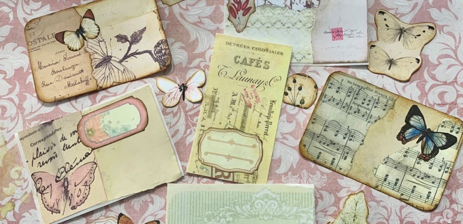 I had some leftovers still out on my workspace from my last project, including some butterflies and labels that I had printed out, fussy cut, and inked; a collection of cards and tags that I had printed and cut out; and a few botanical images I had torn and inked. I also grabbed a sheet of coffee-dyed paper to add a neutral background element to the collages.