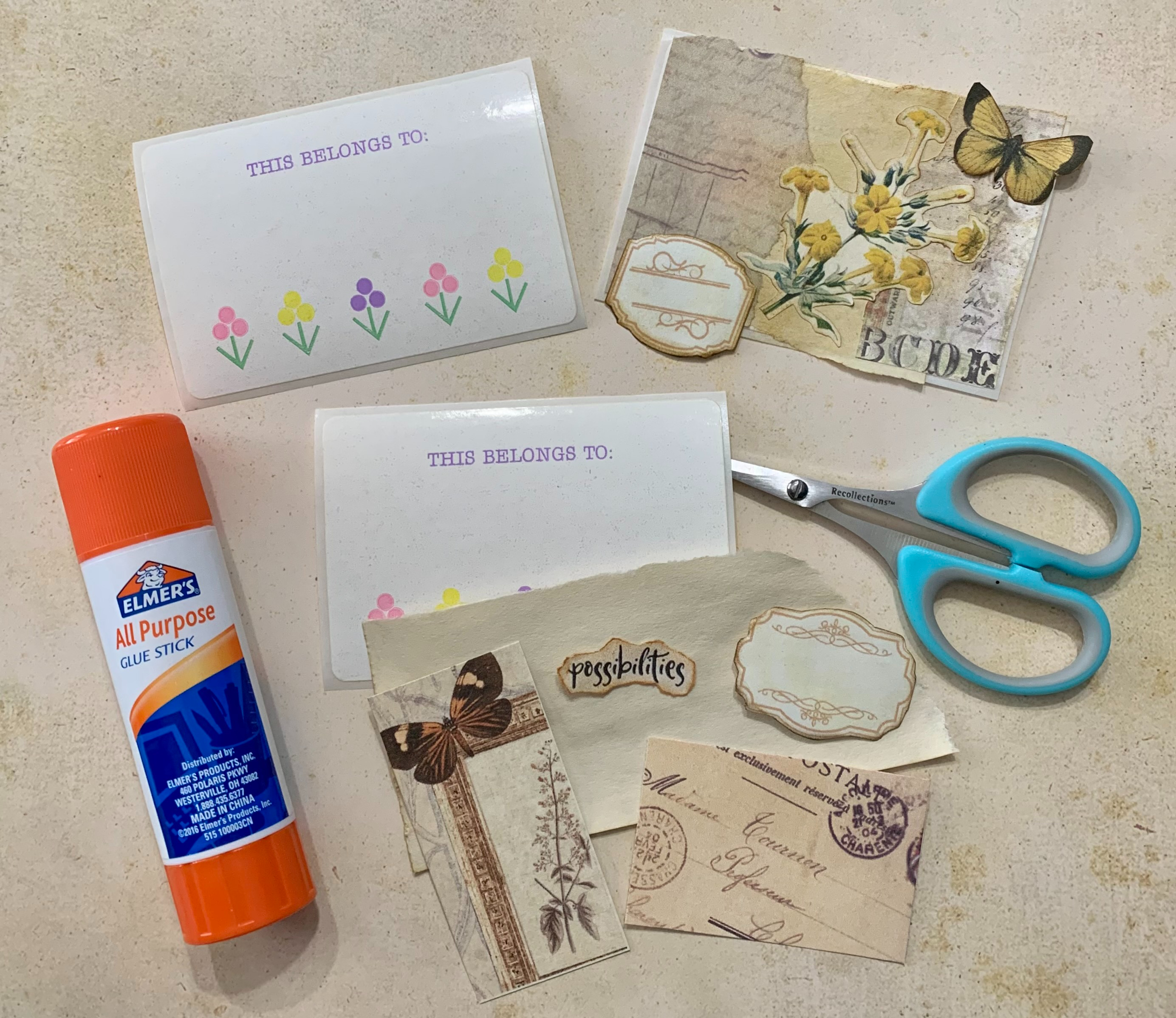I finally decided that one way to use the bookplates was to collage on top of them to create ephemera stickers that I could use later on tags, pockets, or junk journal pages. As you can see from the above photo, the stickers have a glossy finish, but the Elmer’s glue stick worked just fine.