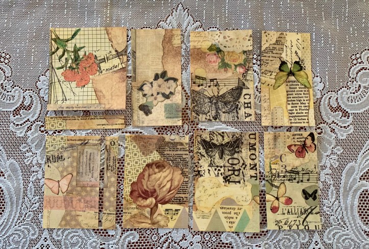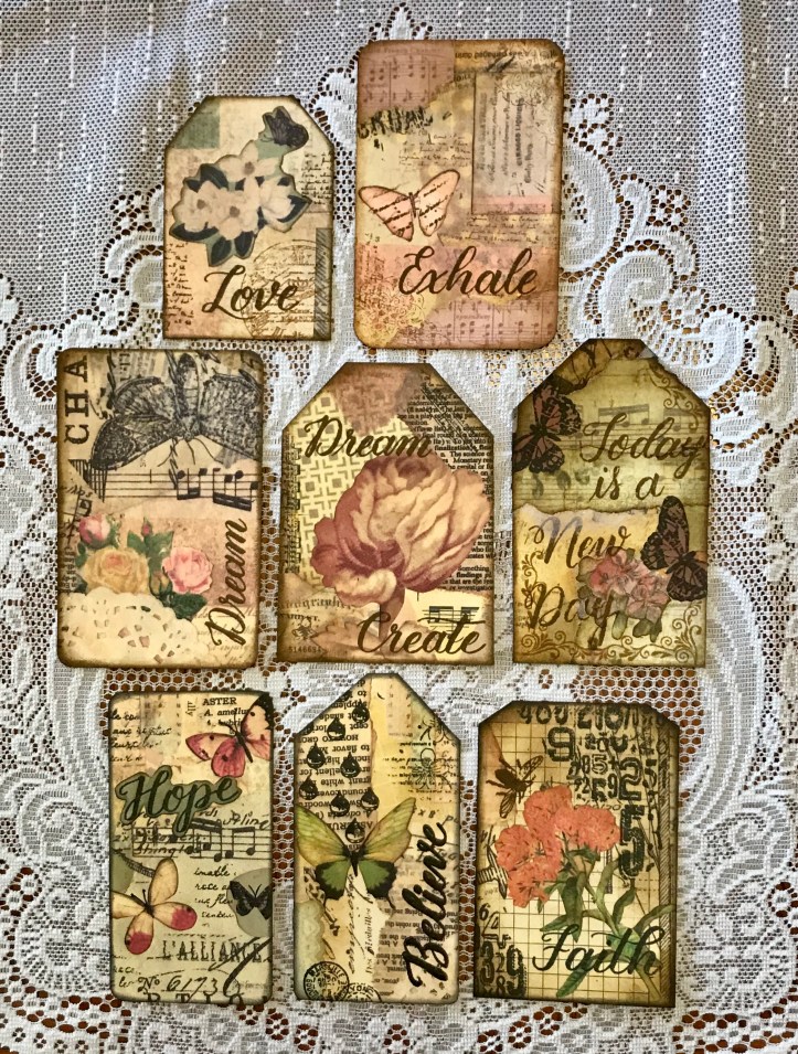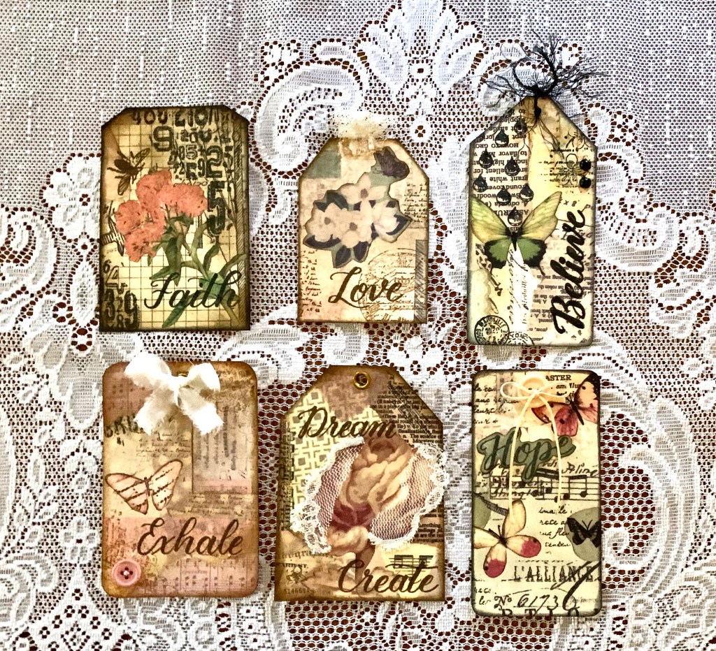 The final step was to add eyelets, ribbon, lace, eyelash trim, and/or buttons at the tops of some of the tags. One I left plain, and one (the one that says “Dream”) I ended up using as a notepad cover so it’s not pictured here with the tags.