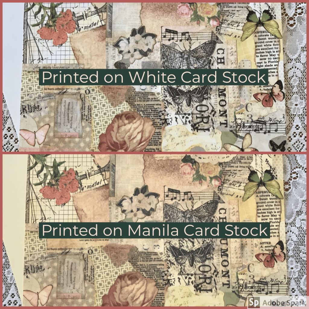 I printed it on white card stock and on manila card stock and you can see what a difference it makes in the “vintage” look of the page! It would be interesting to experiment with printing on coffee- or tea-dyed paper as well.
