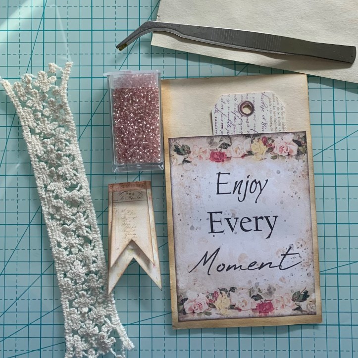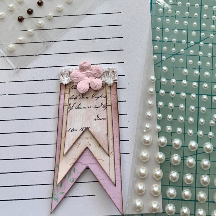 I stuck two of the flags together with a piece of washi tape and glued it to a paper clip. I used a tiny flower cut from a strip of lace and a pink glass seed bead to embellish the paper clip flag. The tweezers came in a jewelry-making kit I purchased and they come in very handy for manipulating tiny bits and pieces.