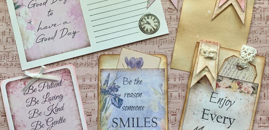 You can see the printables I started with, along with some tea-dyed cards of my own. I didn’t use everything today, but I’m sure I’ll do something with the leftovers later.