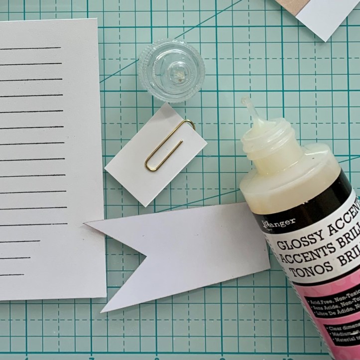 To make the embellished paper clips I started by layering the printed flags, then slipping a paper clip onto a scrap of cardstock and gluing the cardstock to the back of the flags with Glossy Accents. It makes a great strong glue for heavier items like paper clips, and it dries pretty quickly when used in a fairly thin layer.