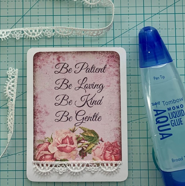 I added a bit of lace trim to the bottom of the image using Tombow liquid glue, which is great for gluing lace and fabric securely to paper. Then I inked the edges of the white card with Tim Holtz distress ink in Spun Sugar.