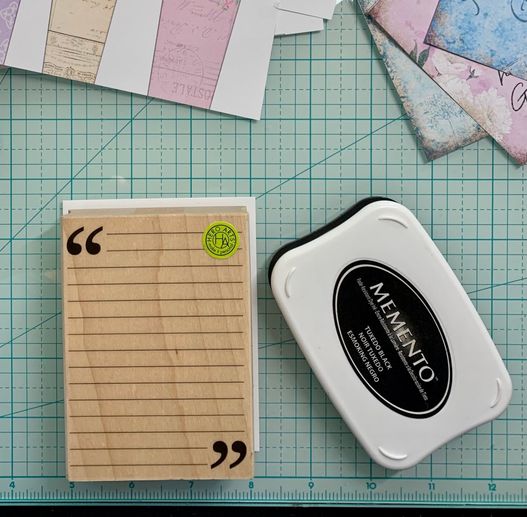 The next one I turned into a journaling card. I used a memo stamp (without inking the quotation marks) and Memento ink in Tuxedo Black to create a lined card, perfect for writing on.