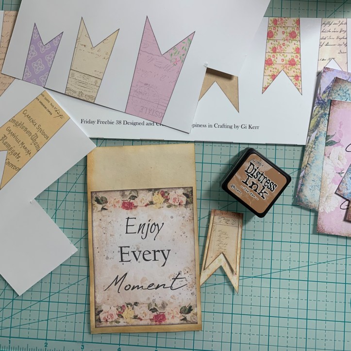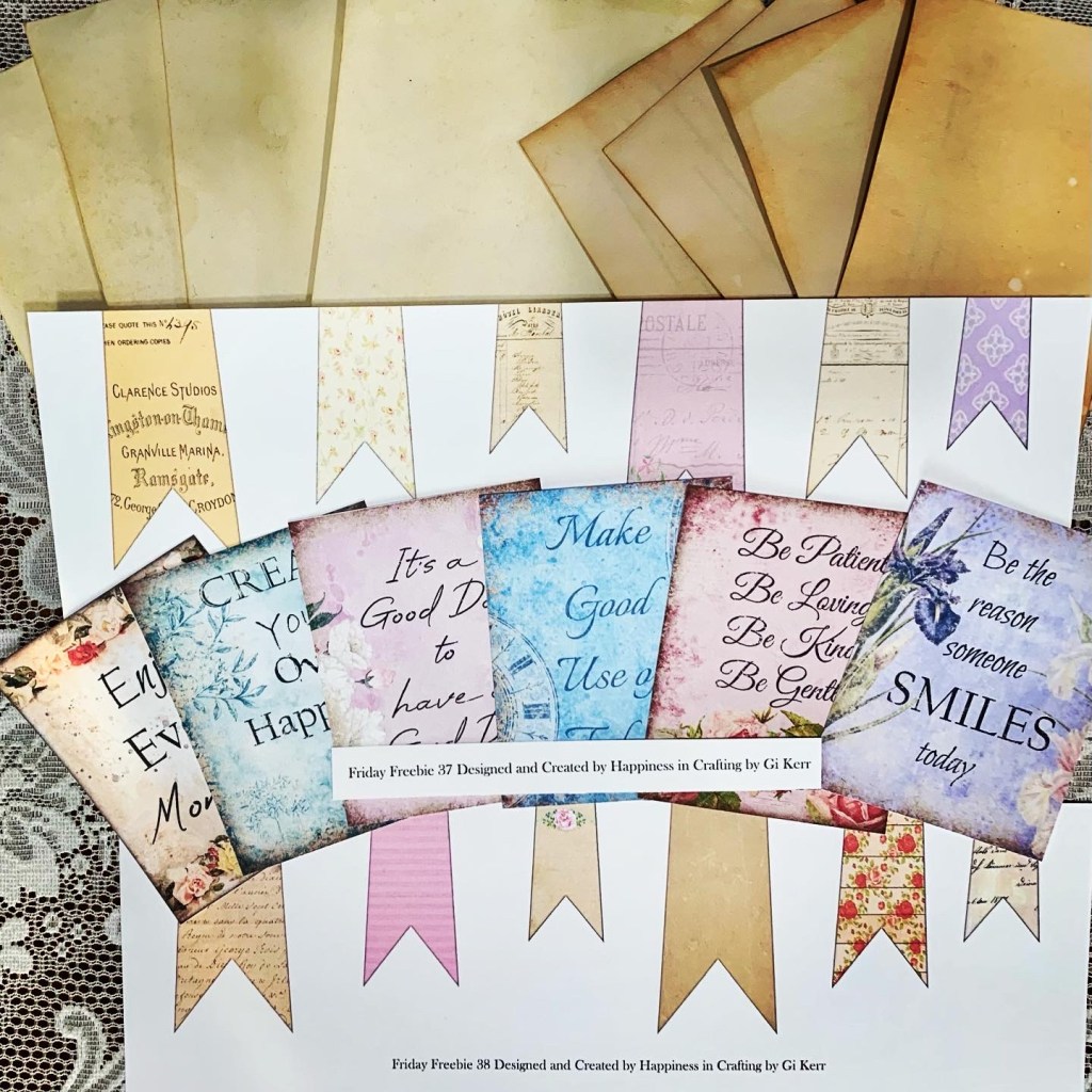 Thanks to Gi Kerr for the free printables she shared in her Facebook Group, Happiness in Crafting. I encourage you to join the group; it’s a supportive group of papercrafters that provides tons of inspiration for junk journaling! Plus, she shares a printable freebie every Friday, and posts a video to her YouTube channel with ideas on how to use it. If you post to the Happiness in Crafting group, please tag me so I can say hello!