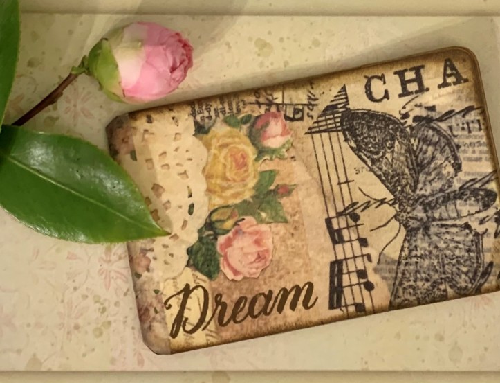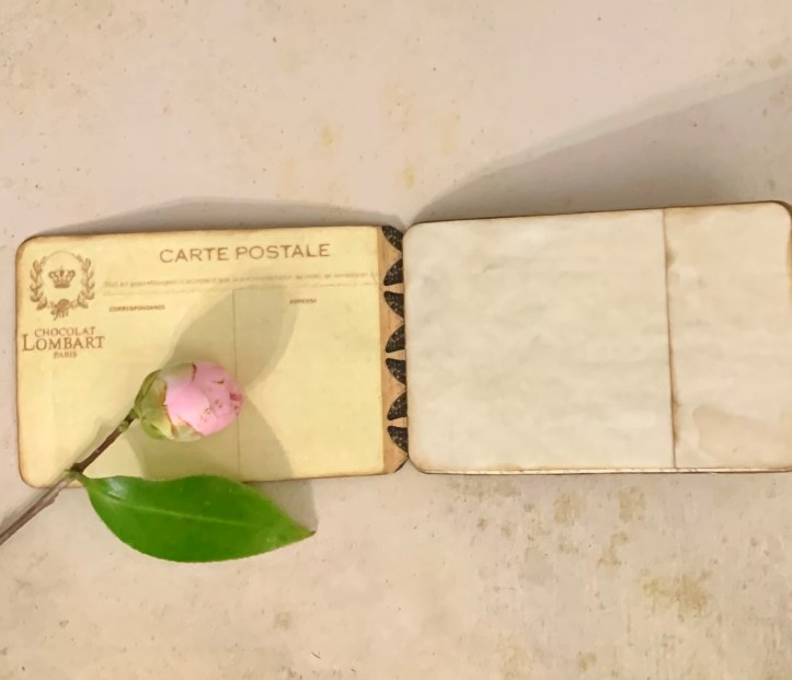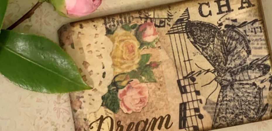 Hello and welcome! Today I’m showing you a mini notepad I created to go in a junk journal. The cover is made from a collage masterboard I created and scanned into my computer. I’ve already shared a couple of other projects I made from that masterboard (some mixed media tags and an envelope and notecard), and this is the third example of something you can do with it. If you’d like a copy to play with, you’ll find a link to it at the bottom of this post.