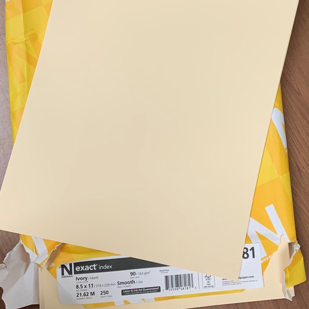This is the product that I use: Neenah 90 pound Index 8.5×11 Ivory. That’s right, they call this color Ivory! What??? I would call this color Manila, as in Manila folders! But it turns out that Manila is the type of paper that folders are made of, not the color of the paper.