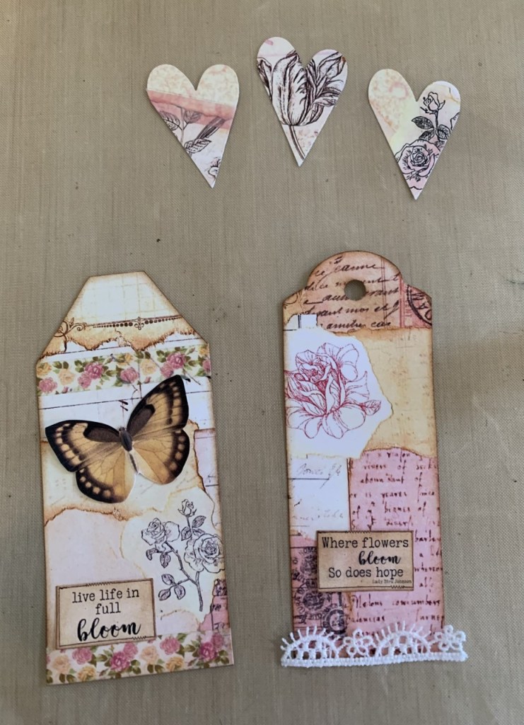 Hi Friends! I want to wish everyone a Happy Valentine’s Day! For those of you who are working on mixed media art or junk journals, I have a free download for you of a pink and sepia, rose-themed collage page. I’ve been playing with it myself to create some tags, but you could also use it for a background page, or even fussy-cut the roses for a project. Here are a few things I’m working on using an asymmetrical heart punch and a tag-topper punch. The sentiments were a freebie from artymaze.